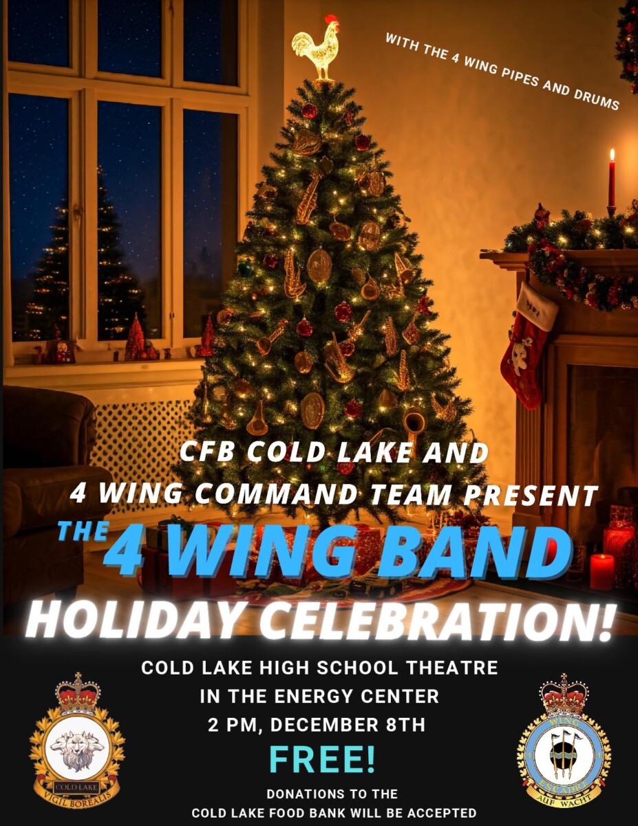 The 4 Wing Band is set to spread holiday joy with their annual Christmas concert, taking place at 2 PM on December 8th at the Cold Lake High School Theatre in the Energy Centre. This year’s event promises to be a heartwarming celebration of the season, combining traditional Christmas music with special performances. Admission is free, with donations to the Cold Lake Food Bank warmly encouraged.