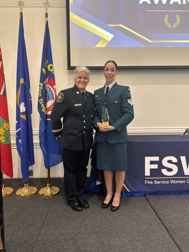 Sergeant Kathleen Jamieson, right, was presented the 2025 President’s Trailblazer Award by Fire Service Women Ontario president of Captain Tracey Shields, Ottawa Fire Service; for her contributions to advancing diversity and inclusion within the fire service and inspiring future generations. Jamieson has been a member of the Canadian Armed Forces’ fire service since 2014, and is a Fire Service Women Ontario board member. Submitted