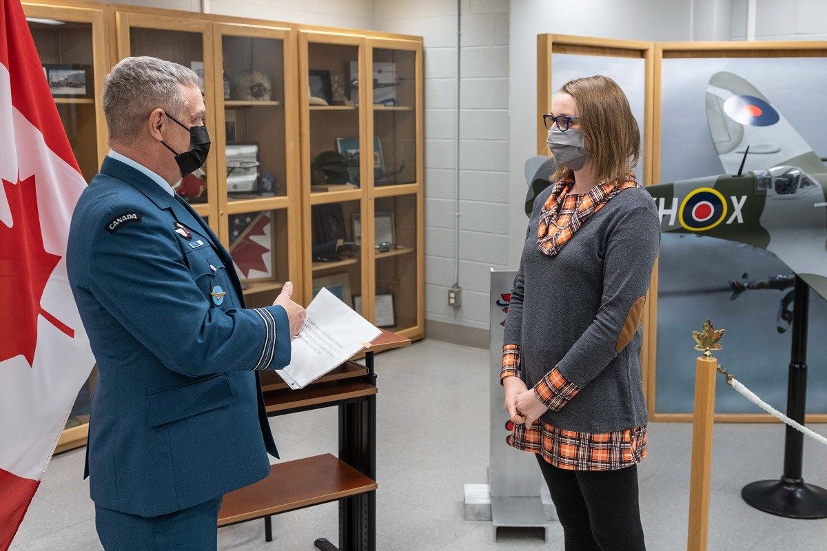 “I recently had the honour to conduct an enrolment ceremony for my daughter, Aviator Patricia Brown. Patricia is enrolled with 403 Helicopter (Operational Training) Squadron as a Financial Services Administrator, and was scheduled to attend the upcoming Basic Military Qualification course in March. She was supported by her husband, Corporal Peter Brown, a Flight Engineer with 403 Squadron, and their three children. Also in attendance were the Squadron Commanding Officer, Lieutenant Colonel Frederic Guenette, and Acting Squadron Warrant Officer (SWO), Master Warrant Officer Jenifer Taylor.