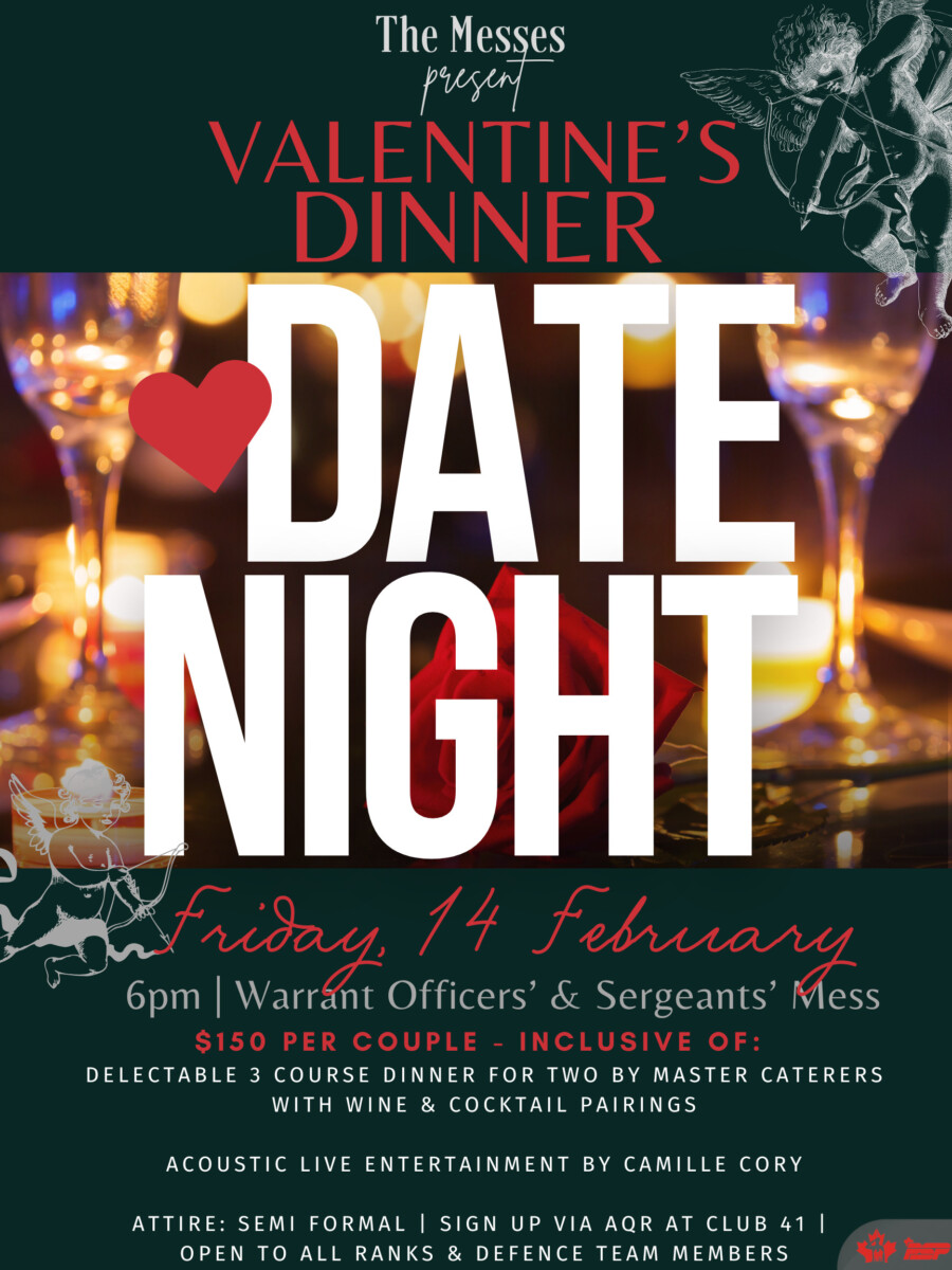 Celebrate love this Valentine’s Day with an elegant evening hosted by the 4 Wing Messes at the Warrant Officers’ & Sergeants’ Mess on Friday, February 14th. Open to all ranks and Defence Team members, this exclusive event promises to make your Valentine’s Day truly unforgettable.
