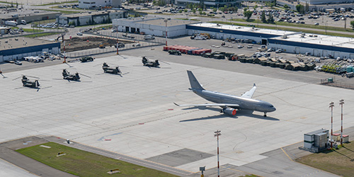 Aerial view of the site and headquarters of the Air Battalion of the Air Task Force during Operation CADENCE. Visible is a CC-330 Husky, a long-range transport aircraft of the Royal Canadian Air Force, positioned in front of CH-147 Chinook multi-role helicopters. In this context, the CC-330 Husky was used to transport the Prime Minister of Canada, the Right Honourable Mark Carney, to Calgary International Airport (YYC) for the G7 Leaders’ Summit in Kananaskis, Alberta.