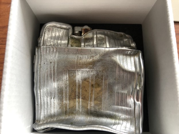 Among the artifacts recovered and returned to Pilot Officer Brown’s family was this aluminum cigarette case, stamped with the initials “GFB.”
