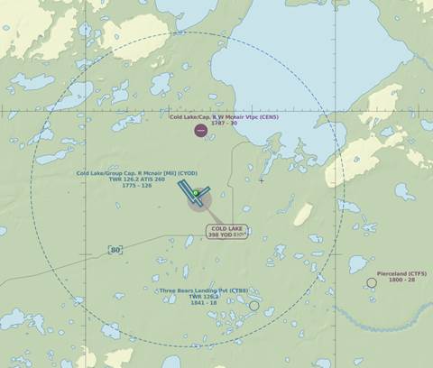 The CYOD Control Zone (map below), extends 11 nautical miles from the base, covering all of Cold Lake North and South, the Cold Lake Municipal Airport, and the southwestern portion of Cold Lake itself. This zone is subject to Transport Canada Canadian Aviation Regulations Part IX regarding UAS or drone flying.