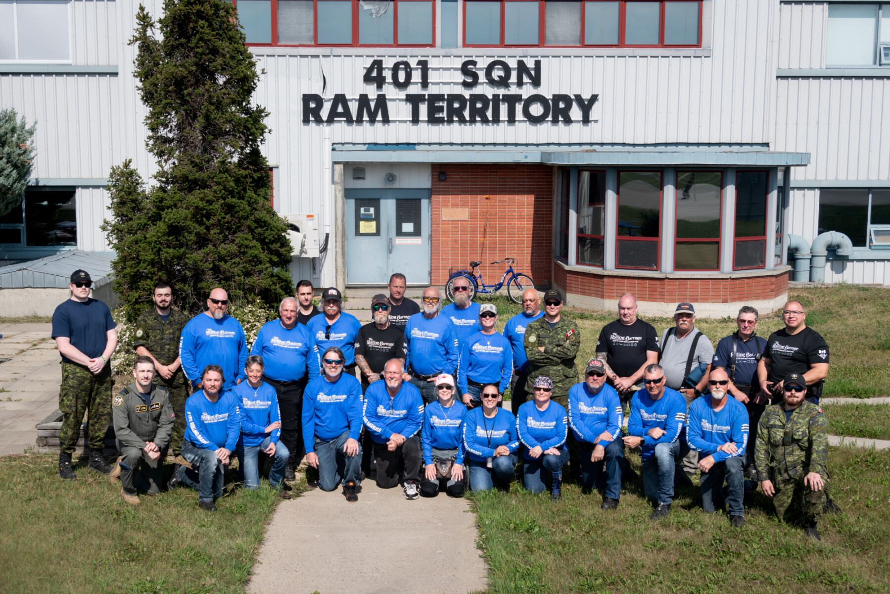 A group photo of members from The Rolling Barrage outside of 3 Hangar during their tour of 401 Tactical Fighter Squadron on 13 Aug 2024 in Cold Lake, Alberta.