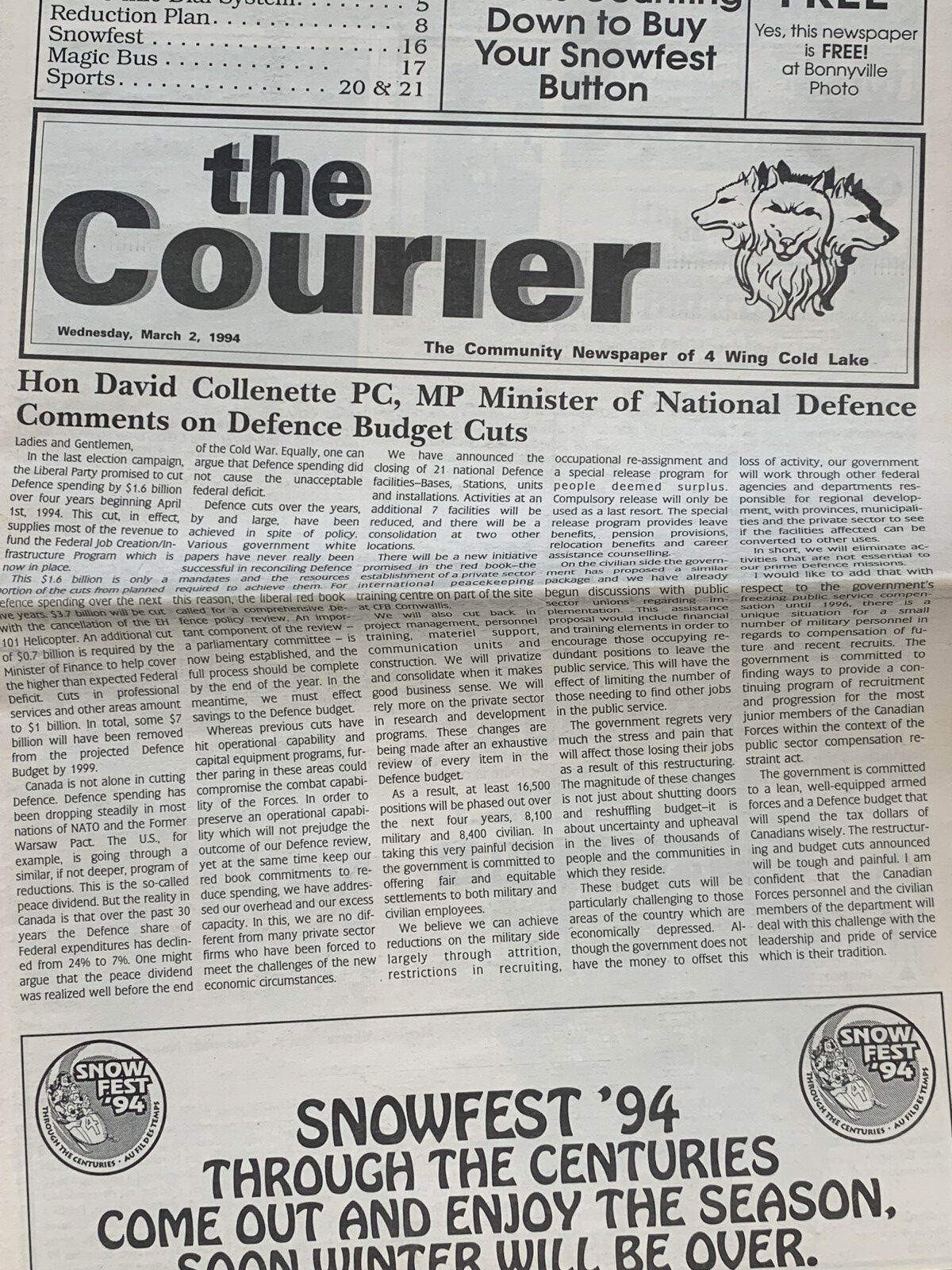 March 2, 1994 – Reaction to the federal government’s 1994 Defence White Paper, which calls for reductions to the Canadian Armed Forces in a new, post-Cold War environment.