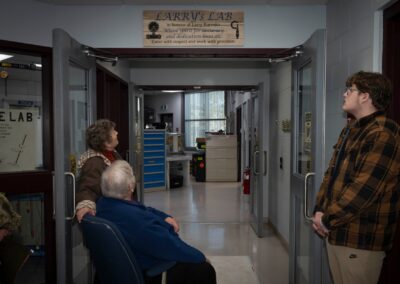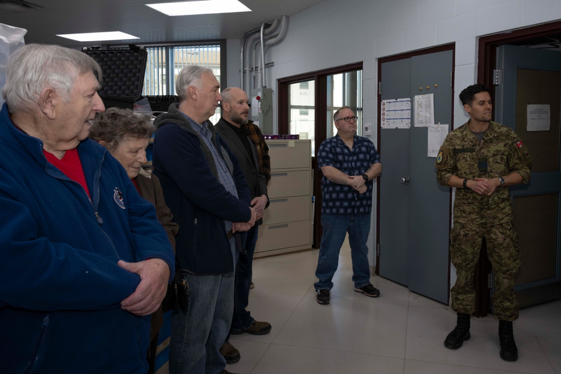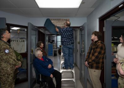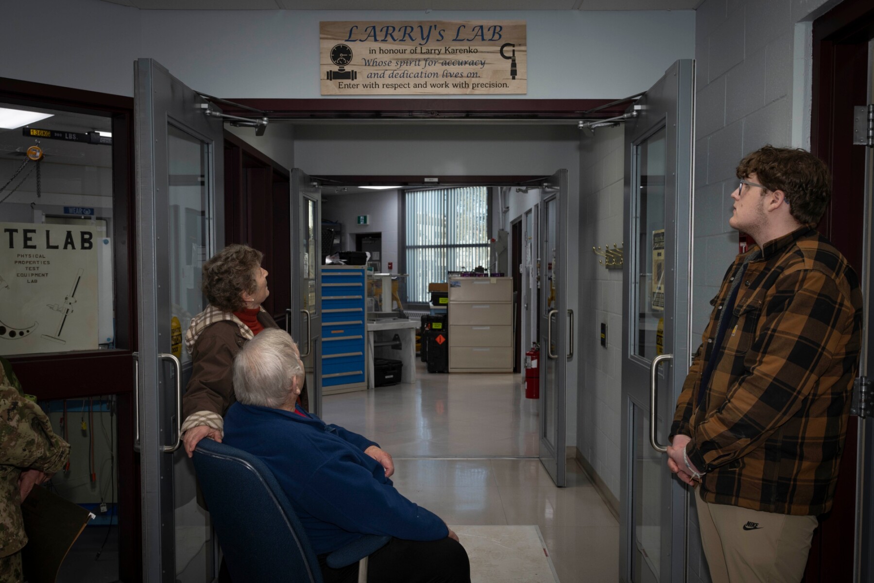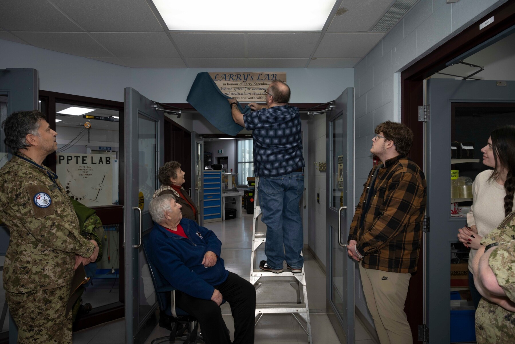 Family members look at the Larry’s Lab plaque dedicating the Physical Properties Test Equipment Lab to Larry Karenko at 4 Wing Cold Lake, Alberta on 16 January 2026.