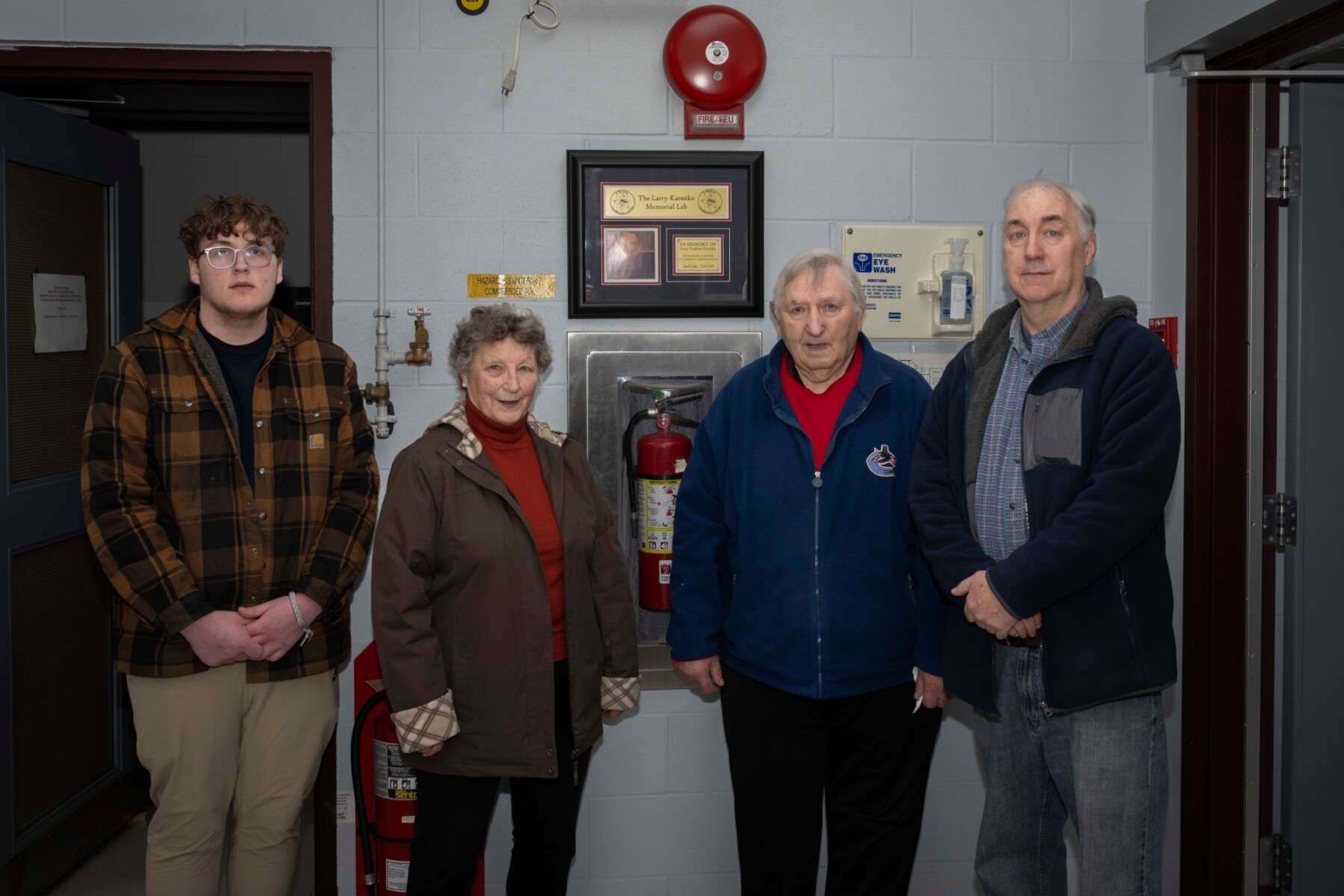 Family members standing with the Larry Karenko Memorial Lab plaque dedicating the Physical Properties Test Equipment Lab to Larry Karenko at 4 Wing Cold Lake, Alberta on 16 January 2026. Left to right: Logan Karenko, Lillian Karenko, Lloyd Karenko, Terry Karenko.