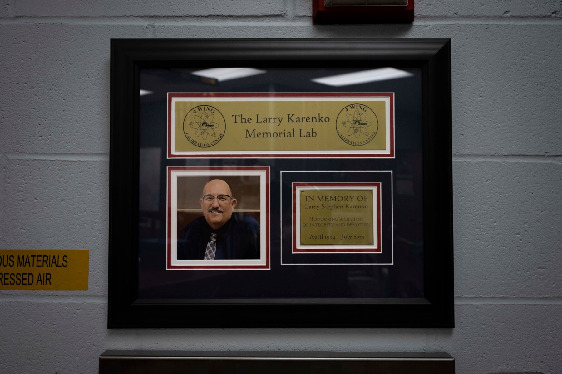 On Friday, 16 January, the 4 Wing Calibration Centre (4WCC) gathered to honour the life, service, and lasting contributions of colleague and friend Larry Karenko, who passed away on 9 July 2025. Larry’s dedication and expertise left a profound impact on the Calibration Centre and the wider CFB Cold Lake community. To commemorate his legacy, the Physical Properties Lab within the facility was formally dedicated in his memory.