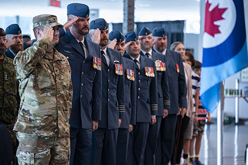 Les invités saluent le drapeau du Canada lors de l’interprétation de l’hymne national au cours de la cérémonie de prise de commandement du 2e Escadron d’opérations de soutien aérien. Trenton, Ontario, 25 juillet 2024.