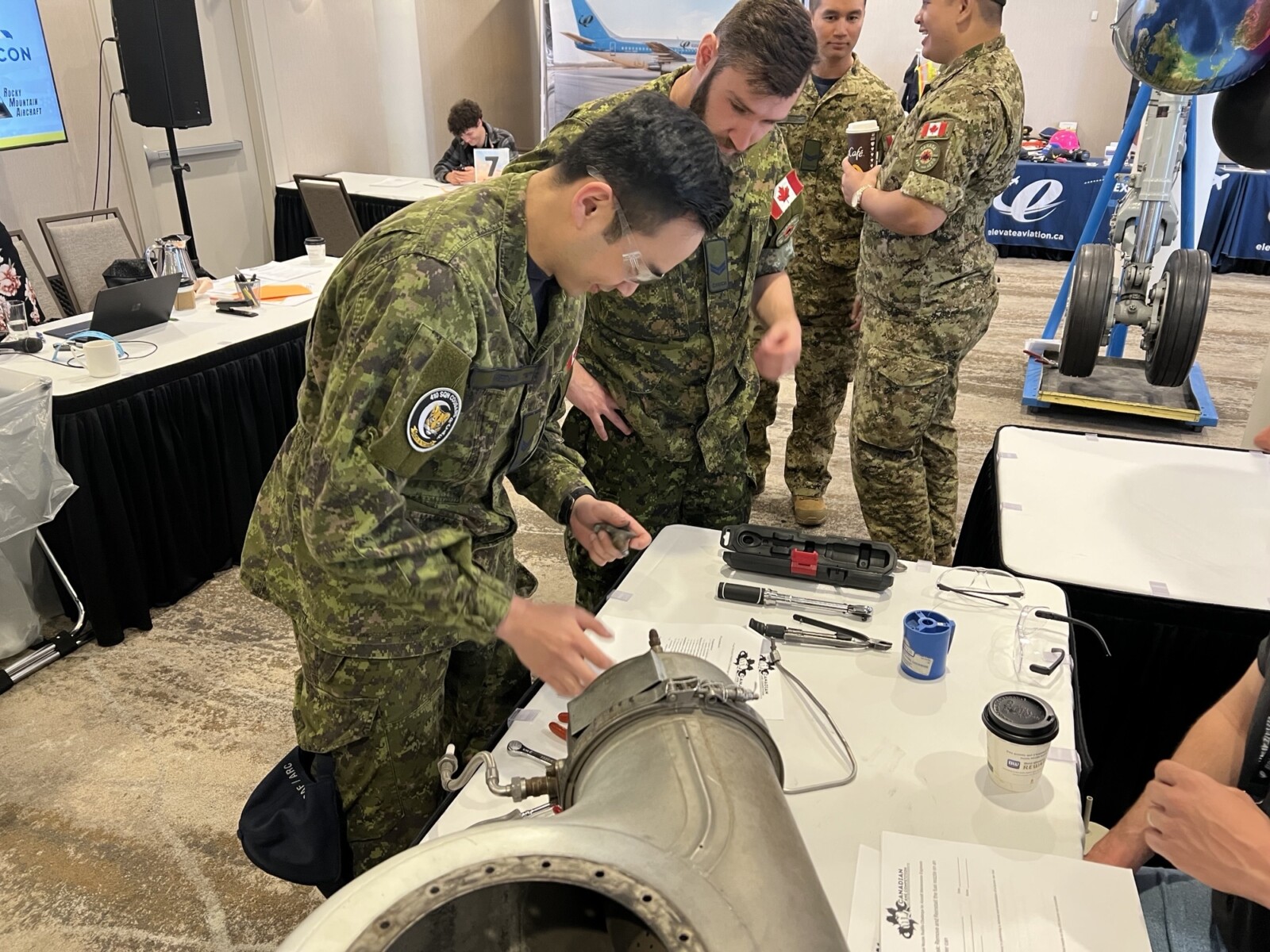 L’équipe, constituée des caporaux-chefs Sean Verheyde et Palmer Clements ainsi que des caporaux Jason Spek, Aaron Medina, Edwin Kho et Daryl Gruezo, a affronté les meilleures équipes du secteur provenant des quatre coins du Canada. Différents défis techniques pratiques étaient au cœur de la compétition, dont le remplacement virtuel des freins d’un Boeing 737, l’inspection de hublots, le remplacement de composantes de divers moteurs et l’inspection d’une aile entoilée.