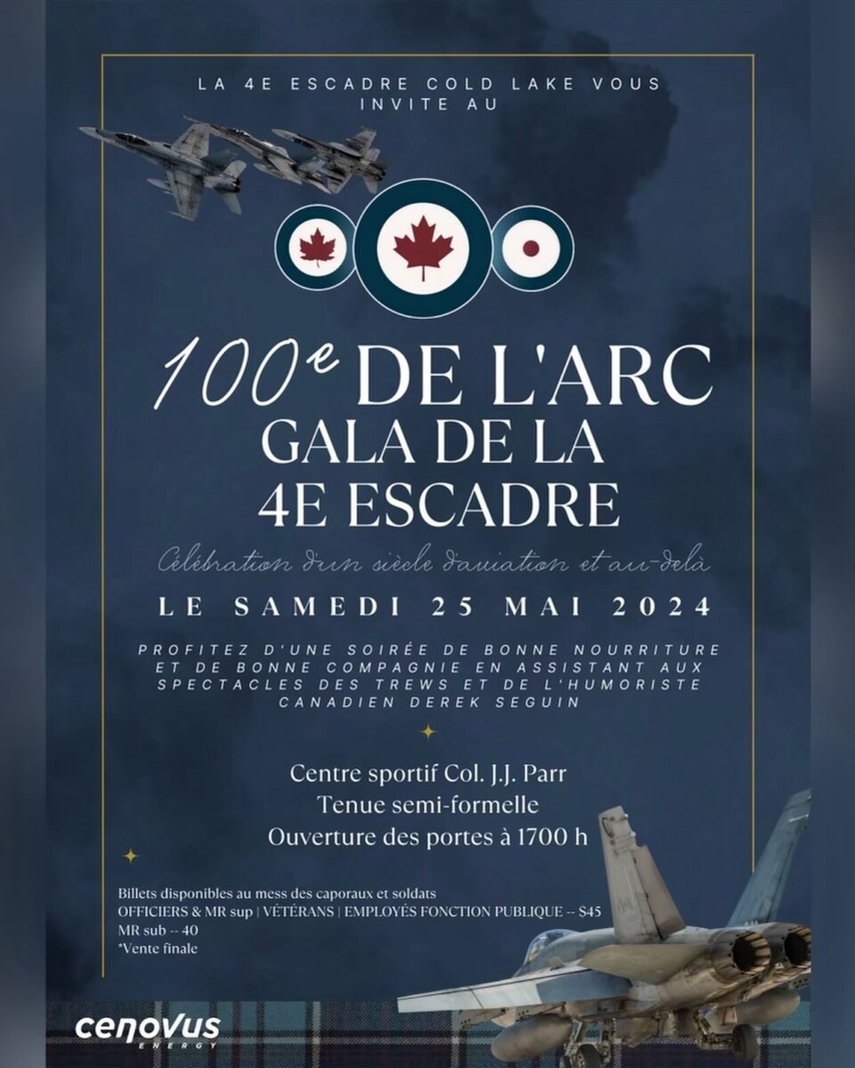 Il est encore possible de se procurer des billets pour une célébration du centenaire de l’Aviation royale du Canada (ARC) à Cold Lake. La Base des Forces canadiennes (BFC) Cold Lake se prépare à accueillir le gala du 100e anniversaire de l’ARC le samedi 25 mai.