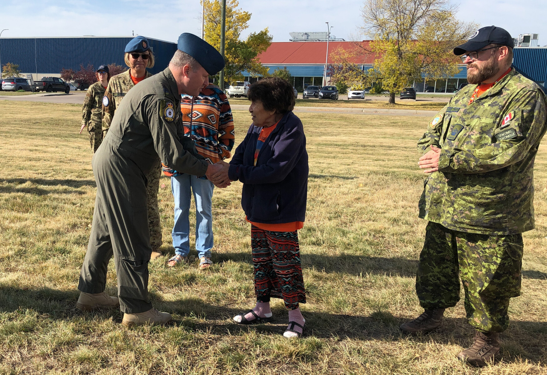 Pour souligner l’occasion, le colonel Mark Hickey, commandant de la 4e Escadre et de la BFC Cold Lake, a remis à madame Gendron l’une des cent pièces de monnaie spéciales du centenaire de l’Aviation royale canadienne (ARC) émises au Canada.