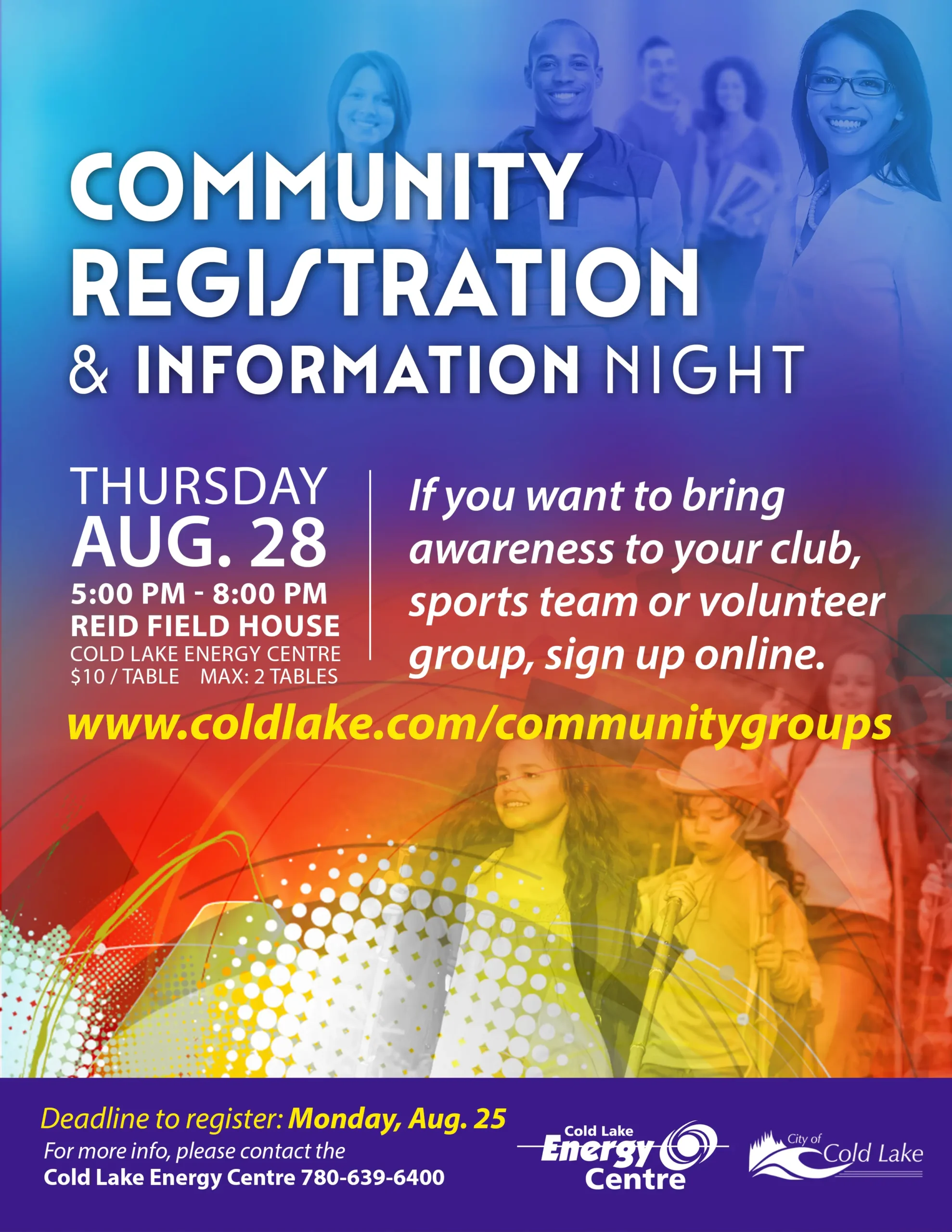 Réservez la date : la Ville de Cold Lake tiendra une soirée d’inscription et d’information communautaire le jeudi 28 août à 17 h au Cold Lake Energy Centre. Cet événement permettra aux résidents de rencontrer, en un seul endroit, des organismes locaux, des clubs et des services communautaires.