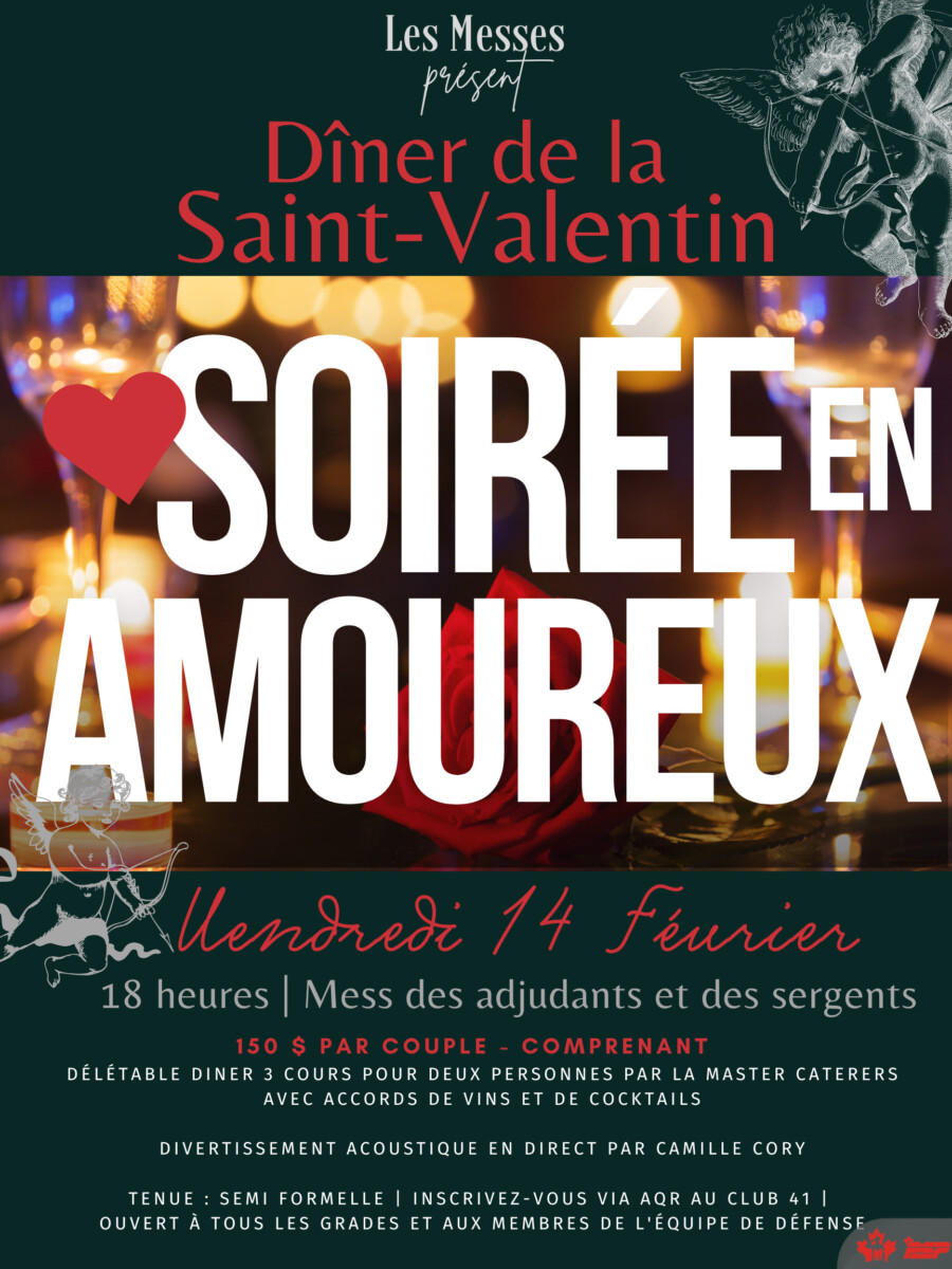 Célébrez l’amour en ce jour de la Saint-Valentin avec une soirée élégante organisée par les messes de la 4e Escadre au mess des adjudants et sergents, le vendredi 14 février. Cet événement exclusif, ouvert à tous les grades et membres de l’Équipe de la Défense, promet de rendre votre Saint-Valentin vraiment inoubliable.