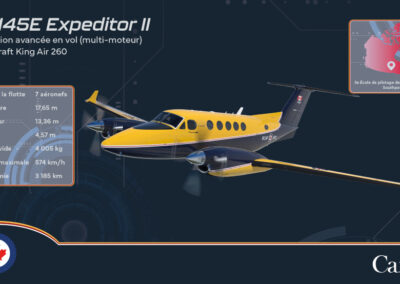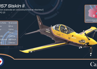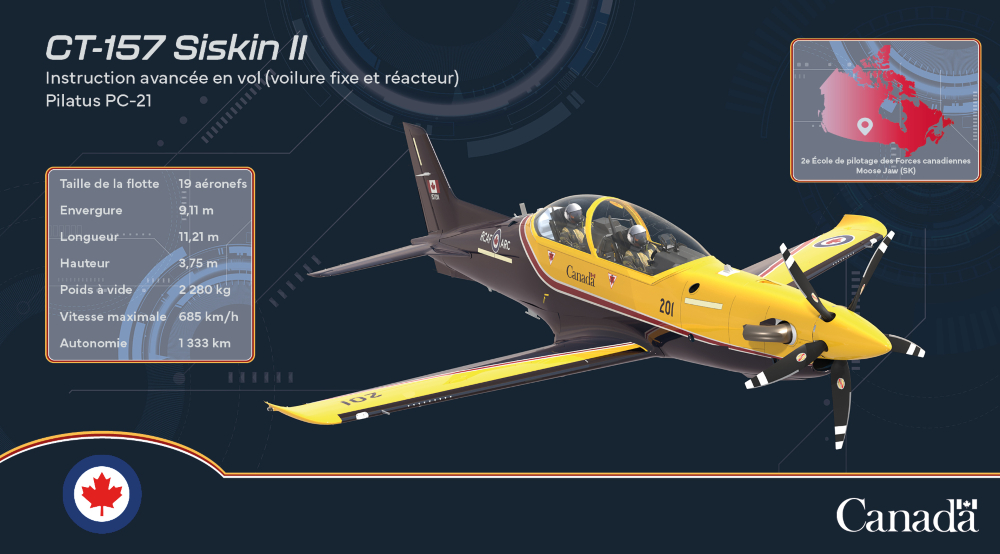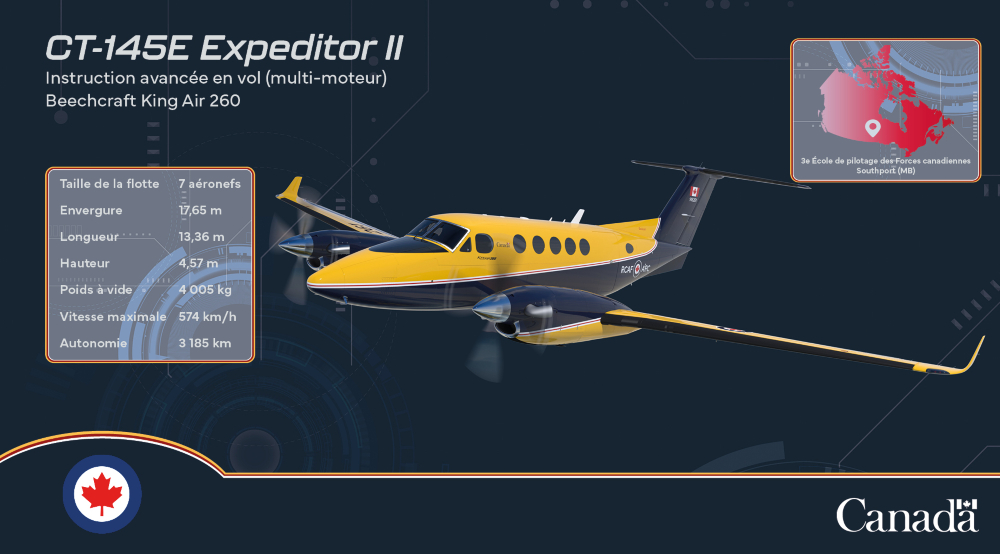 Cet avion de formation au vol avancé préparera les pilotes à une formation plus spécialisée, notamment sur des avions multimoteurs et des avions de chasse. Dix-neuf avions Siskin II – d’après le Siskin Armstrong Whitworth, le premier véritable avion de chasse de l’ARC et le nom de son équipe de voltige originale –seront également basés à la 15e Escadre Moose Jaw. - CT-145E Expeditor II