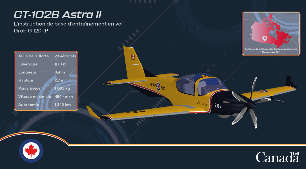 L’avion Astra II servira d’avion de formation au vol de base pour les nouveaux pilotes. Il s’agit d’une version améliorée de l’actuel Grob 120A (CT-102A) utilisé pour la formation. « Astra » signifie « étoile » en latin, ce qui correspond à la devise de l’ARC « À travers les embûches jusqu’aux étoiles ». Cette nouvelle flotte de 23 avions sera basée à la 15e Escadre Moose Jaw, en Saskatchewan. - CT-157 Siskin II