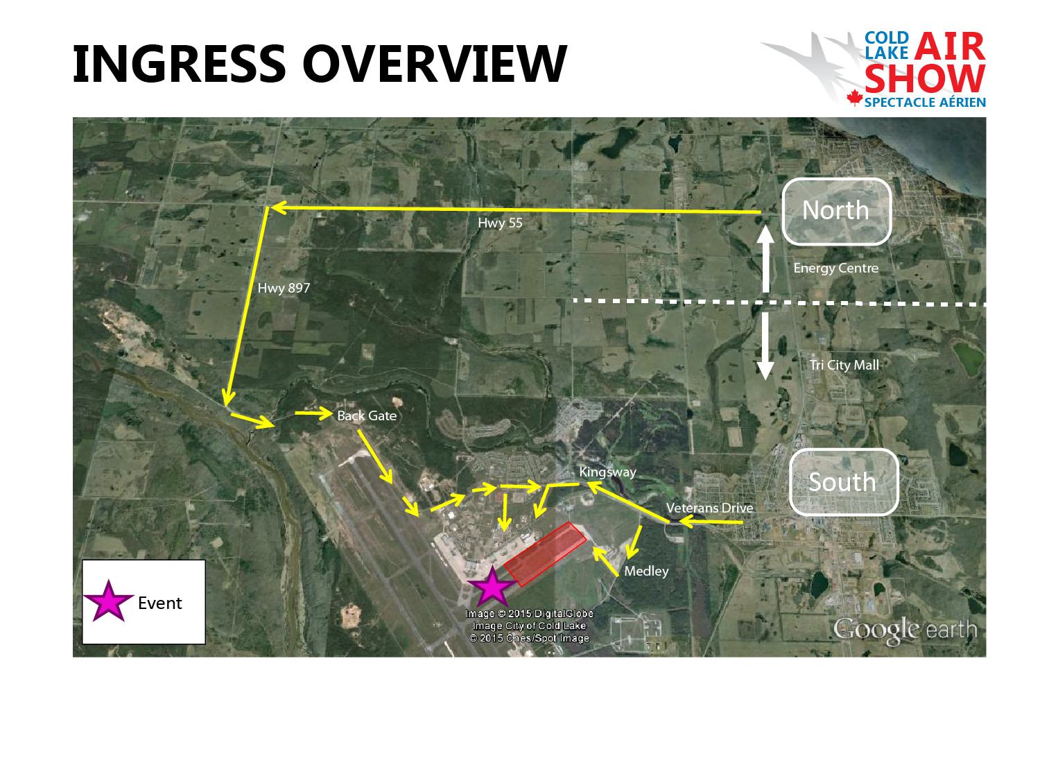 Pour plus d’informations, consultez la page officielle du plan de circulation du spectacle aérien de Cold Lake.