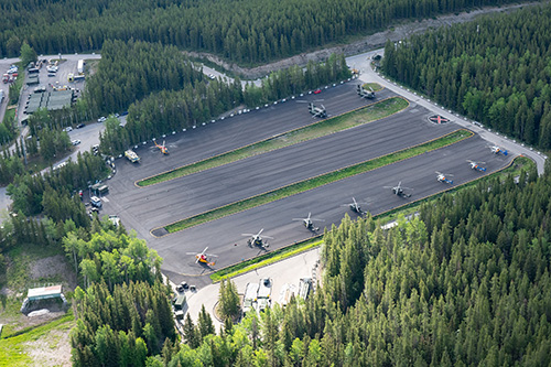 Vue aérienne du site d’atterrissage d’hélicoptères de la Force opérationnelle aérienne durant l’opération CADENCE à Nakiska. On y distingue plusieurs aéronefs, notamment des hélicoptères utilitaires de transport tactique CH-146 Griffon, des hélicoptères polyvalents CH-147, ainsi que des hélicoptères AS350 et H145 de la Gendarmerie royale du Canada. Dans la partie supérieure gauche de la photo figurent les quartiers généraux de la Force opérationnelle aérienne.