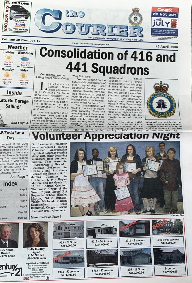 25 avril 2006 – Les 416e et 441e Escadrons sont regroupés au sein du 409e Escadron d’appui tactique à la 4e Escadre et à la BFC Cold Lake dans le cadre d’une réorganisation des unités de chasseurs d’appui tactique de la base.
